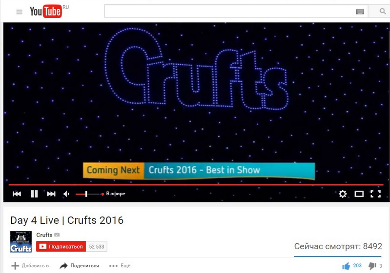 13 марта вечером - 10447 человек смотрели прямую трансляцию Best in Show Crufts-2016