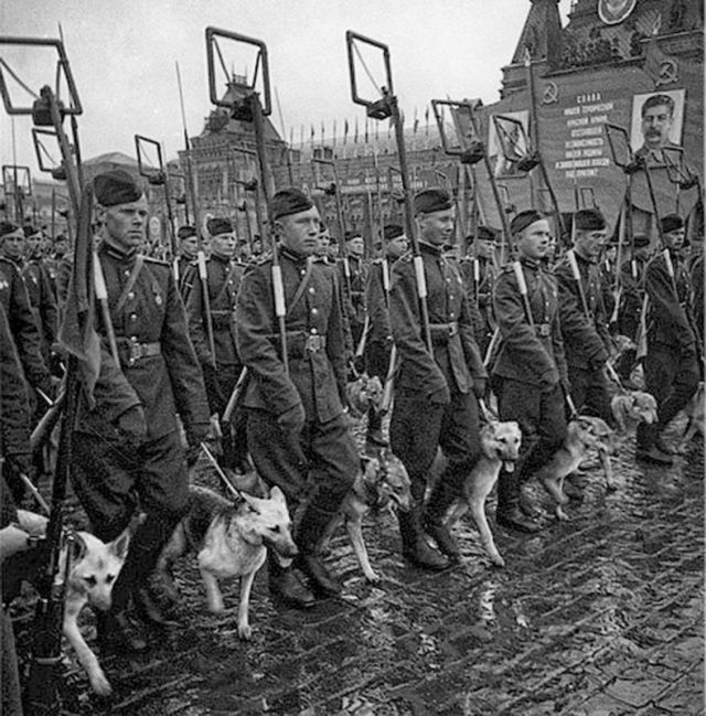 по Красной площади шли собаки со своими проводниками. Во время войны эти собаки были настоящими
