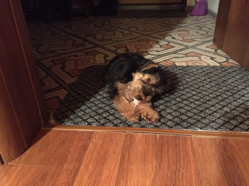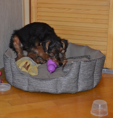 Насчёт ухода из дома при бодрствующем щенке. Мы в нашей семье договорились, что если кто-то уходит надолго, то он ОБЯЗАТЕЛЬНО даёт Кайсе какое-нибудь лакомство: крошечный кусочек сыра, варёного рубца или типа того. Причём вне зависимости от того, остаётся кто-то дома или нет!