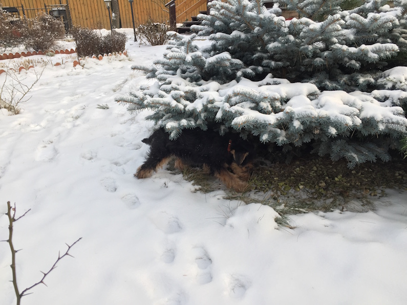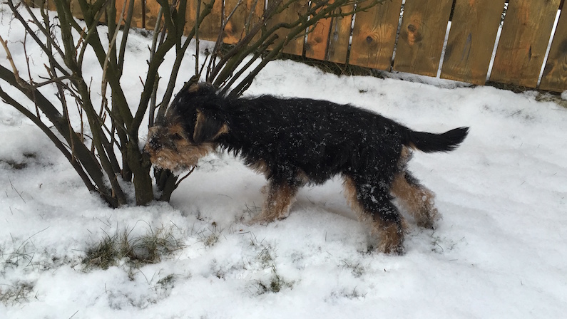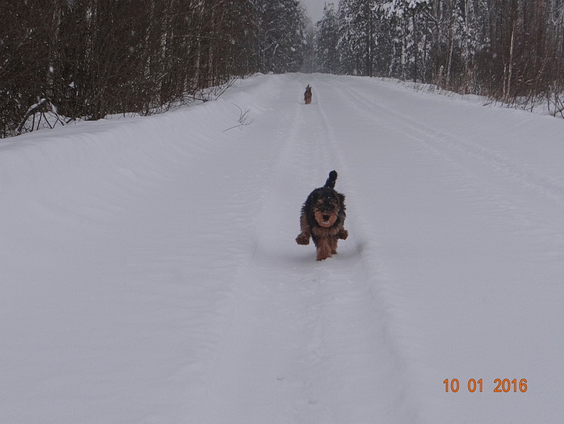 Гулять Кроха любит очень. Носится со скоростью пули, «вспахивает» снег носом, тявкает и снова носится.