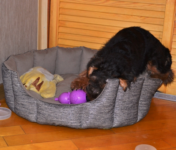 Смысл игрушки в том, что туда можно поместить лакомство (я использовала кусочек сушеного рубца, предварительно помыв игрушку) и щенок будет занят какое то время ее добычей.