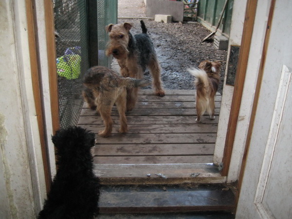 Быстро этот ребёнок освоился в доме, освоение закончилось на двери во двор (есть на фото). Вчера утром выпустила дома щенка и не тех, с кем она раньше играла, а Мэджика. И открыла им дверь во двор, погода ведь отличная, как раз для прогулок детишек! Мэджик стояла в напряженной позе, но, видимо, какие-то моменты я проглядела, т.к. щенок не испугался этой позы, а наоборот - очень обрадовался! Они стояли и обнюхивали друг друга - "разговаривали". Потом Мэджик такая же напряженная (на мой взгляд) пошла на крыльцо, и щенок - за ней. Мэджик спустилась и стоит на земле и ждет... Щенок осторожно преодолевает ступеньки и идет по земле за Мэджиком! И вот сразу же, на первом выходе во двор щенок освоил весь двор, гуляла около 30 мин. по всей территории ! Фото не сделала, некогда было, готовила собакам завтрак...