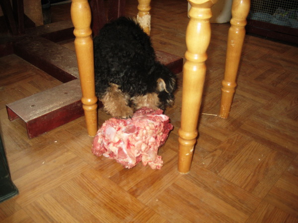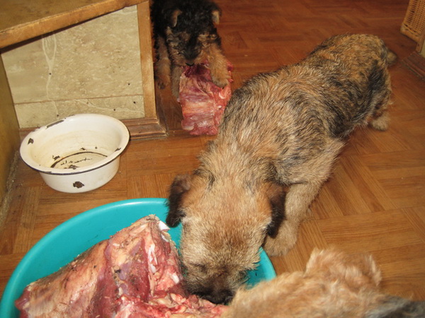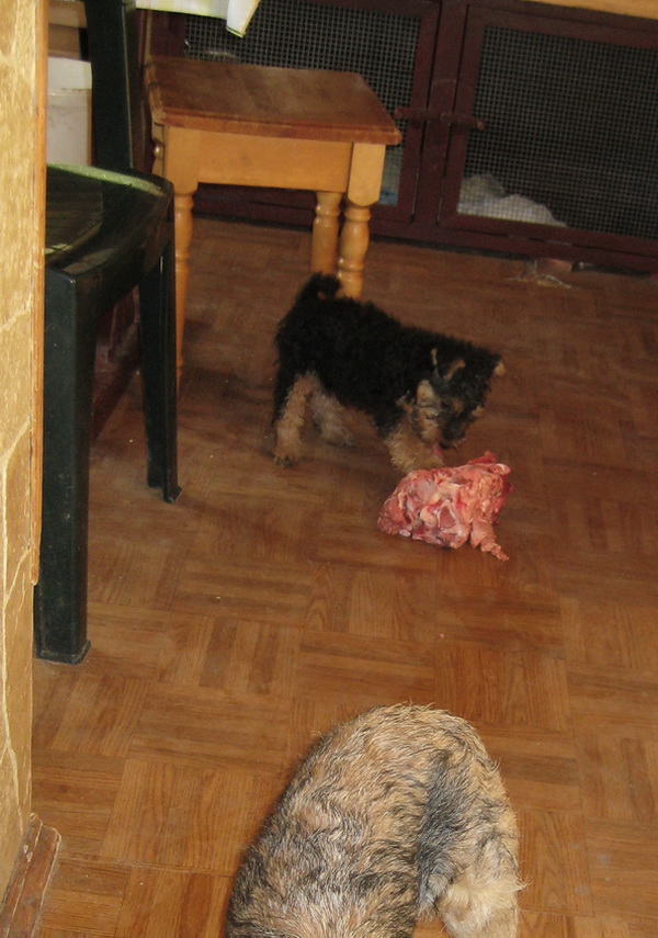 Видимо после вчерашнего освоения двора наша маленькая гостья - 2- мес. пра-правнучка стала совсем "крутой" - очень нагло вела себя сегодня утром при приготовлении им завтрака из мяса, привезенного её хозяевами. Из тазика с кусками мяса утащила довольно большой кусок, несмотря на то, что кусок этот добывала в борьбе с вельшем и с бордером.