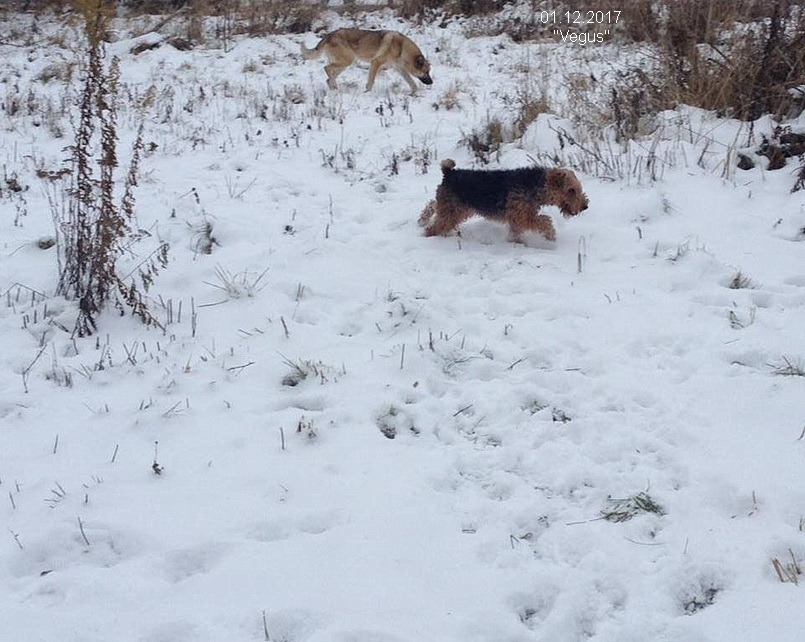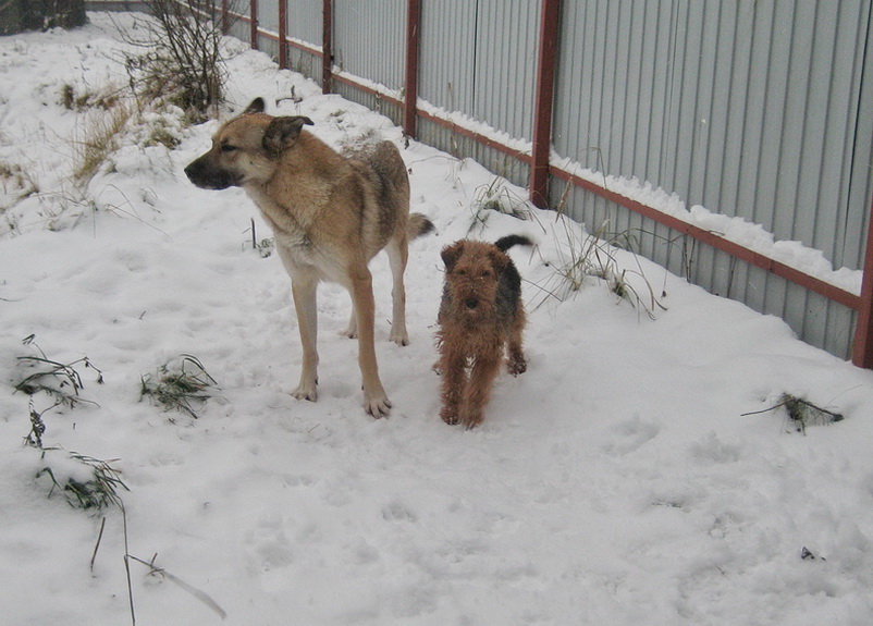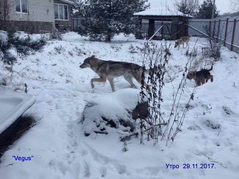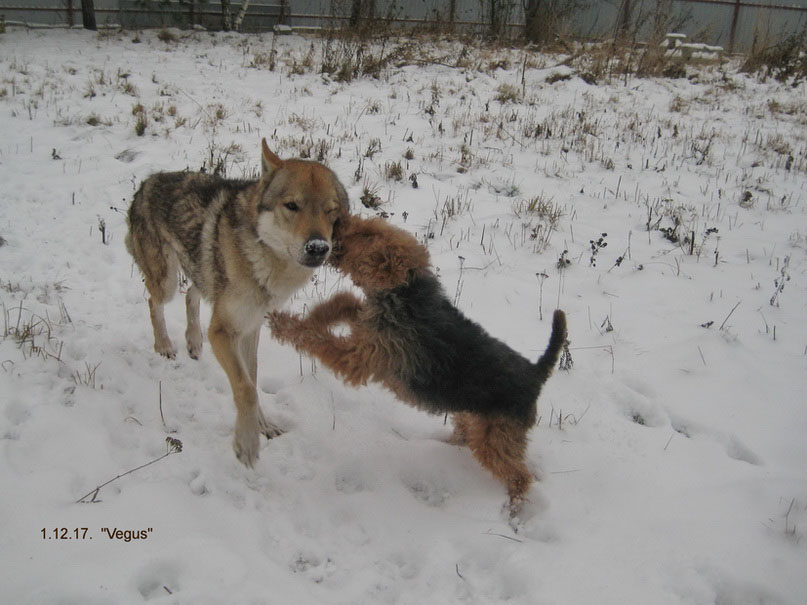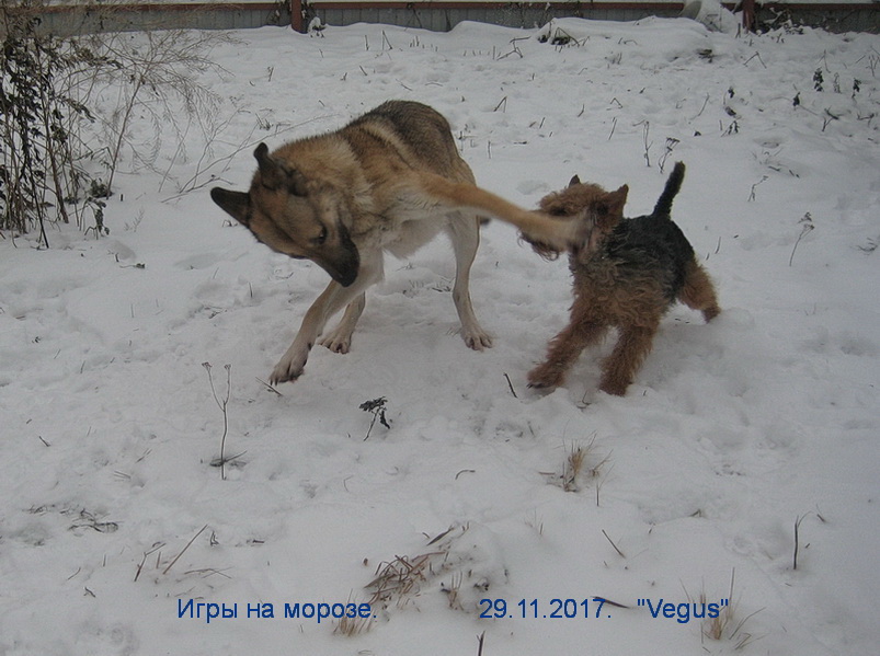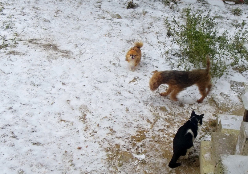 Здравствуй, Зима! - 1 декабря - холодно, ветер, снег лежит. Собаки играют после завтрака.