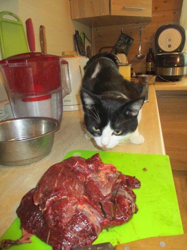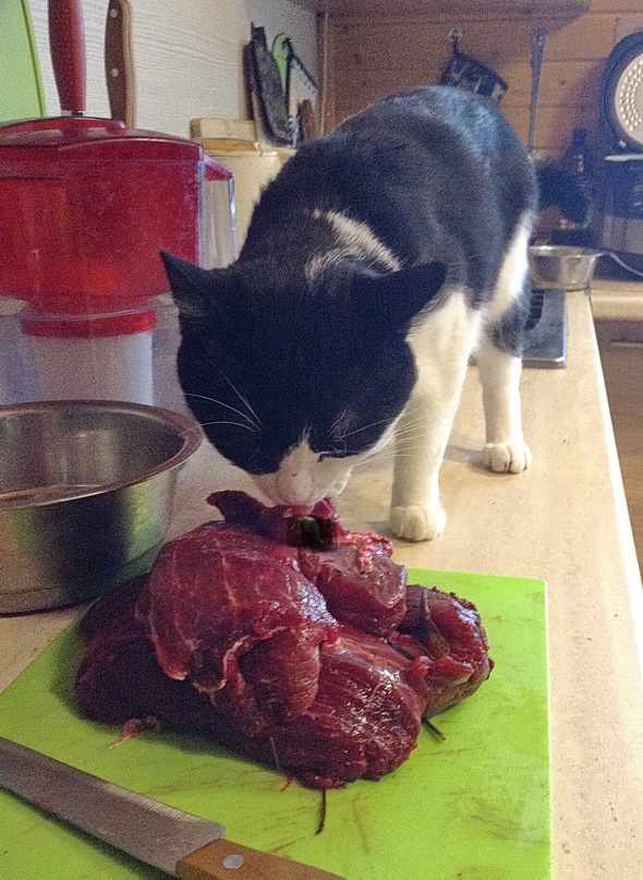 2. позже Кот обнаружил сырое мясо и, конечно же, заинтересовался :