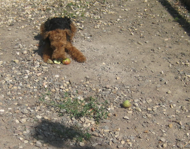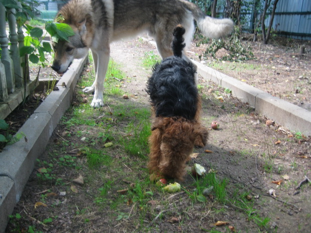10 августа - жара, терьеры плавают, потом бегают-играют, едят яблоки. Ну а овчаркам в бассейн вход закрыт,