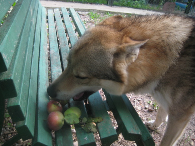 влчак прячется в тенечке. Ну а яблок он себе добудет ;)