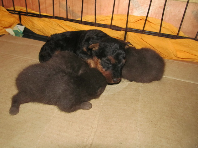 А тем временем дома, в питомнике Детский сад пополняется - вельш выкармливает щенков енотовидной собаки