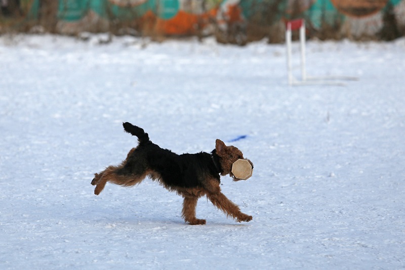 Вольф на апортировке. Спортсмен бросает апортировочный предмет на расстояние не менее 10 метров, затем по указанию судьи отправляет собаку. Когда собака принесёт апортировочный предмет спортсмену, забрать его можно только через 5 секунд по указанию судьи.