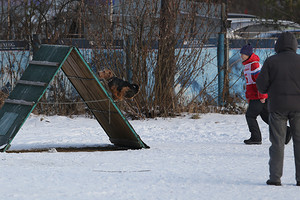 Ещё фото с соревнований по ОКД-мини ранга САСТ 25 ноября в г. Екатеринбурге. Несколько моментов выполнения упражнений на соревнованиях. Всего выполняли шесть упражнений - движение рядом, апортировка, возвращение на обозначенное место, подход к спортсмену (команда "Ко мне"), комплекс ("Сидеть", "Лежать", "Стоять"), преодоление препятствий. Фотографии от организаторов соревнований, автор фото Г.Гурин