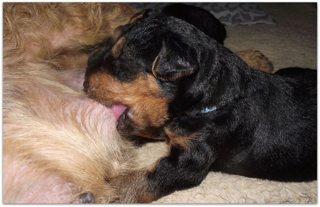 На днях вельшики попробовали свой первый прикорм. Деткам мясо очень понравилось – думала останусь без пальцев. Мясоеды! На следующий день войдя в вольер вместе с Груней, дети, виляя хвостиком, побежали ко мне, а не к Маме. Конечно, знают уже толк в еде... ;)