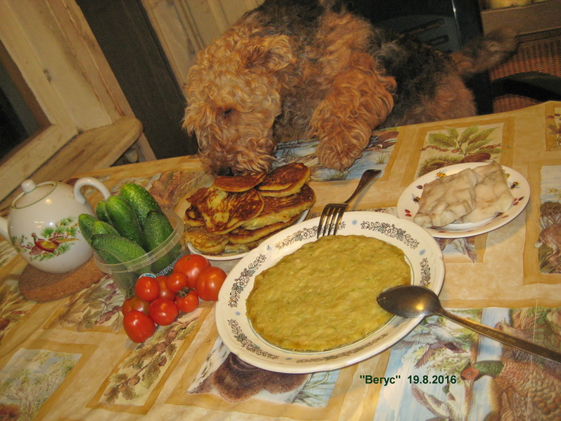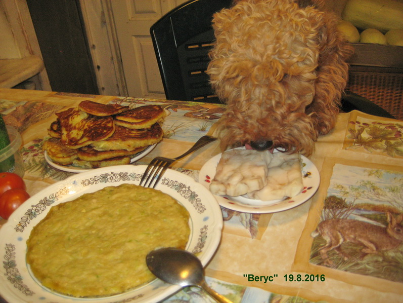 Правильно, собаки же не коровы, чтобы сырые кабачки есть. А вот оладушки из кабачков, на маслице поджаренные, - совсем другое дело, можно и поесть. Наши собаки тоже с удовольствием едят кабачковые оладушки.