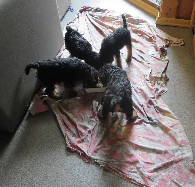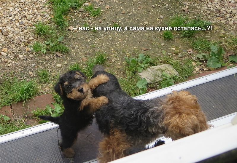 а тут, где живут щенки, щенки утром были отправлены во двор, вместе с мамой, чтобы не мешали уборке и приготовлению завтрака.
