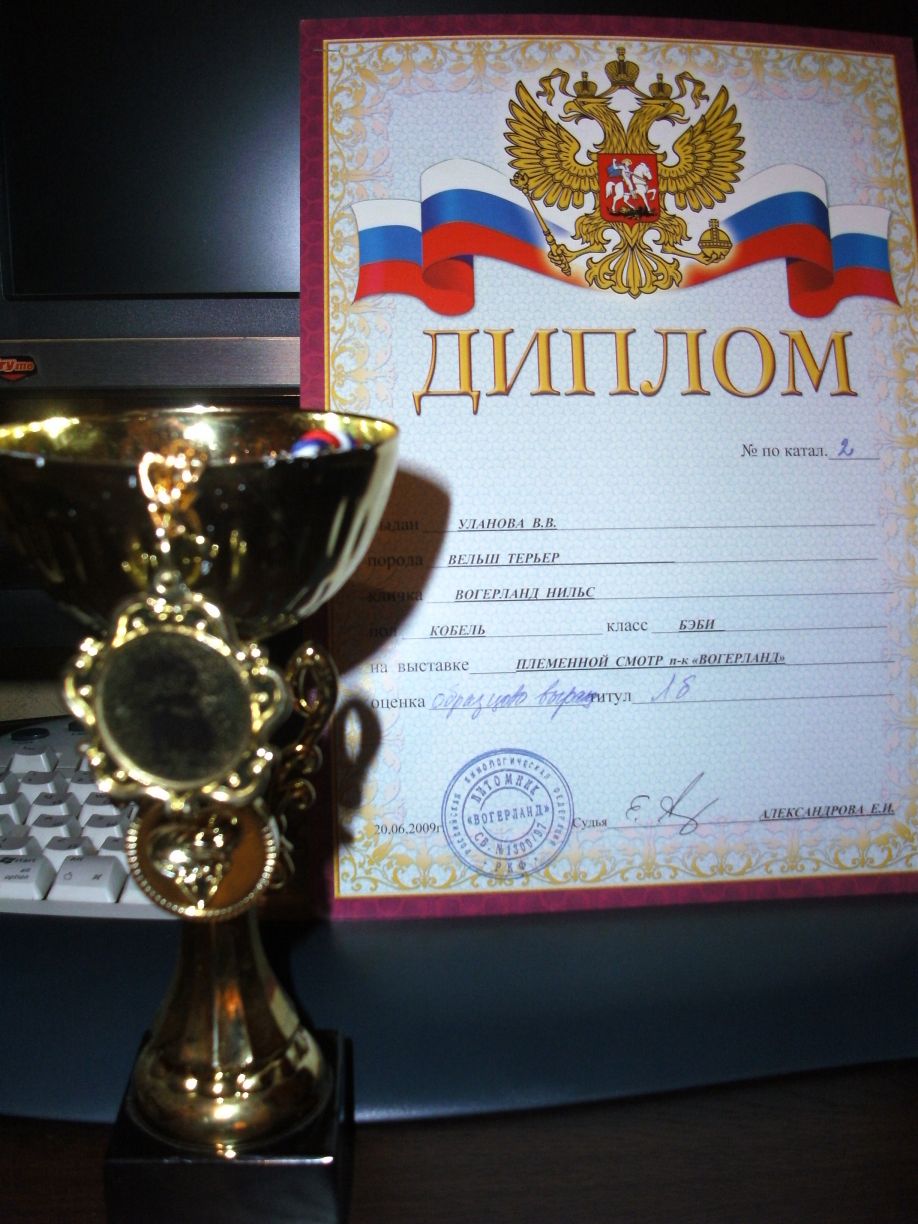 Наша первая выставка прошла очень даже успешно( титул Лучший Бэби ), хотя ошибки и волнения присутствовали .Нильсу вручили кучу памятных призов и очень красивый диплом с кубком – первый в его жизни . Мы так радовались, словно выиграли Чемпионат Мира
