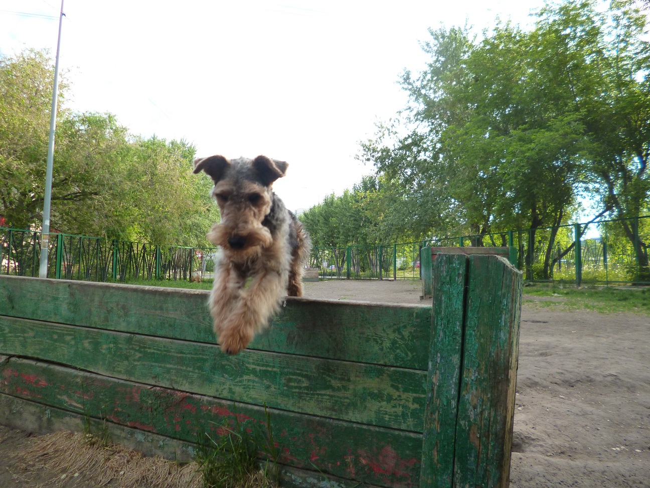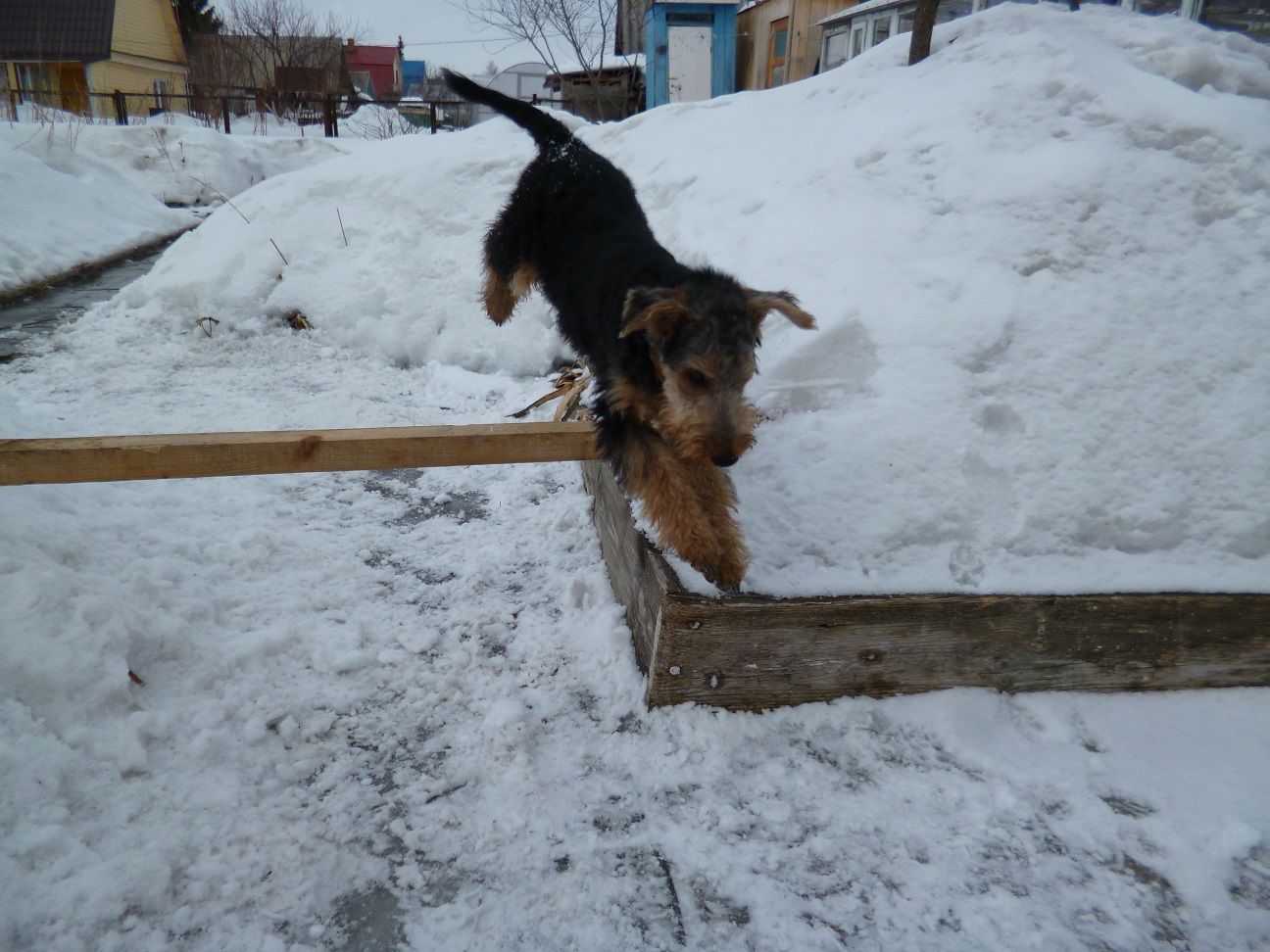 На даче соорудили барьер, и я стала учить его прыгать через барьер. Научился быстро, сначала прыгал за мной, а потом и сам. Вольфу очень понравилось, прыгал с удовольствием. Наигрался, набегался и напрыгался, что и нужно маленькому вельшику.