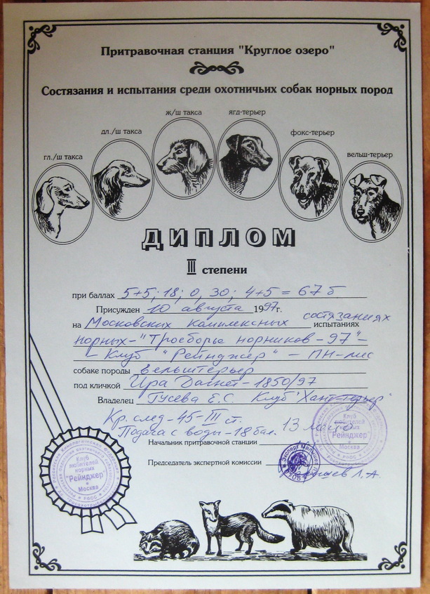 Результаты участия вельш терьеров в Комплексе 9-10 августа 1997 г. на ИПС «Круглое Озеро»,