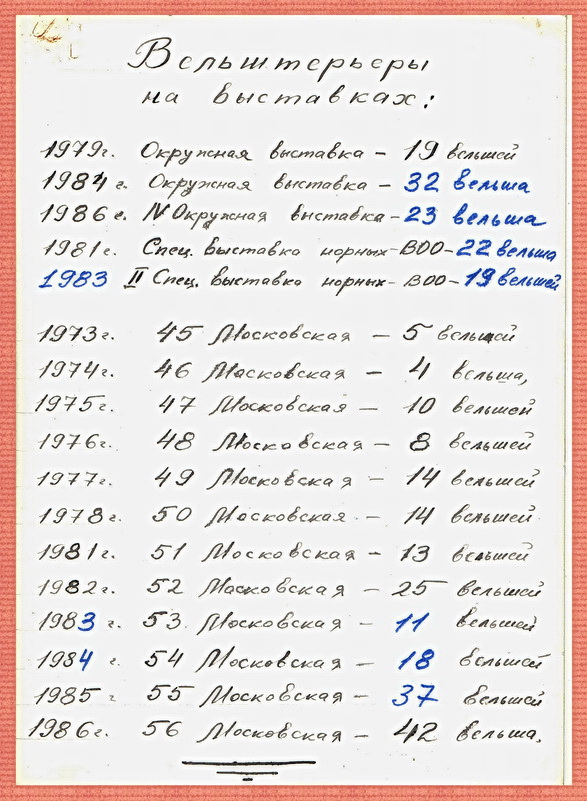 Вот из архивных бумаг – фото сводки по участию вельш терьеров на выставках собак 1973 – 1986 г.