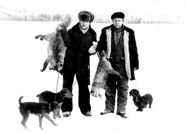 У нас одновременно с Юконом жила сука Майя Филл (Мерседес - Филиппова Ю.А. х Таунус Удар - Подколзиной И.). Тоже отличная собака -чемпион породы (тогда это звание получить было ох как непросто!). Некрупная, азартная собака. Юра Филиппов начал притравливать ее в 4-месячном возрасте. Ласково называл ее внученькой, приговаривая на притравках: "Давай, внученька, давай!" Вот она и давала всем лисам жару! Сам же Юра и запретил потом притравливать ее в Вышнем Волочке, называя сволочью, - много она погубила лис хватками не по месту. Щенки Юкона с Майкой тоже были очень хорошими. У меня есть фото Майки с Юконом. Постараюсь их отсканировать и показать здесь.