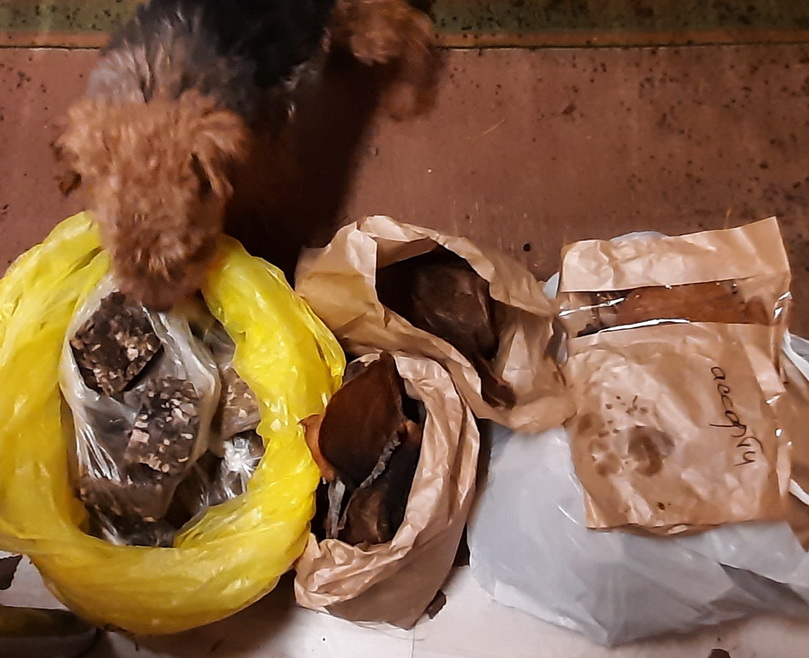 Сегодня на корм моей псарне к уже привычному нам рубленному говяжьему рубцу были новые "Телятина на кости" и "Колбаса с печенью"