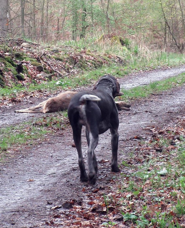 Как я понимаю, это итог работы по кровяному следу. Анонс выполнен: собака нашла тушу, пришла за ведущим и привела его к ней.