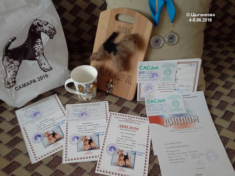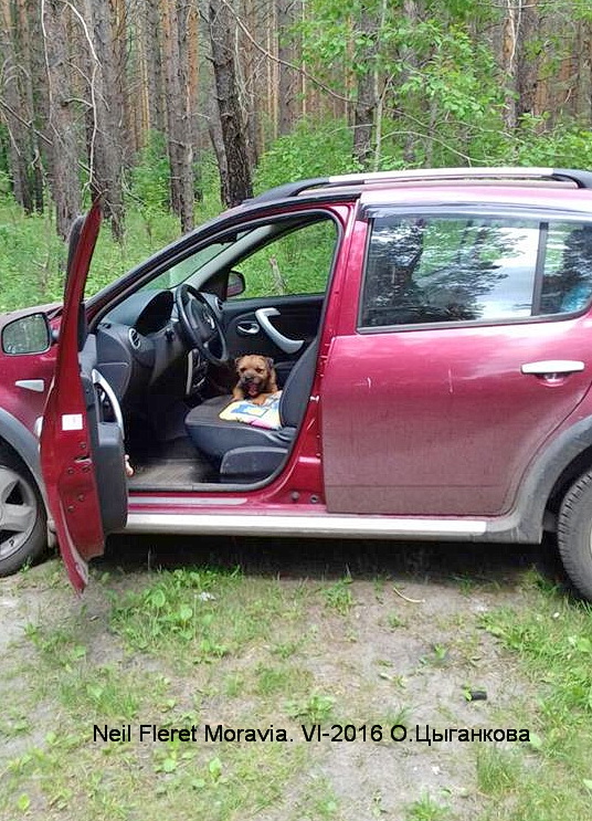 В нашей компании ездил бордер терьер Neil Fleret Moravia, на выставках 2×CAC в Самаре он получил 2 JunCAC и ЛПП,