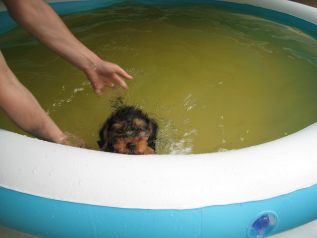 12 июля - жара, поэтому купание терьеров продолжается, даже щенок научился плавать!