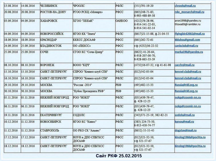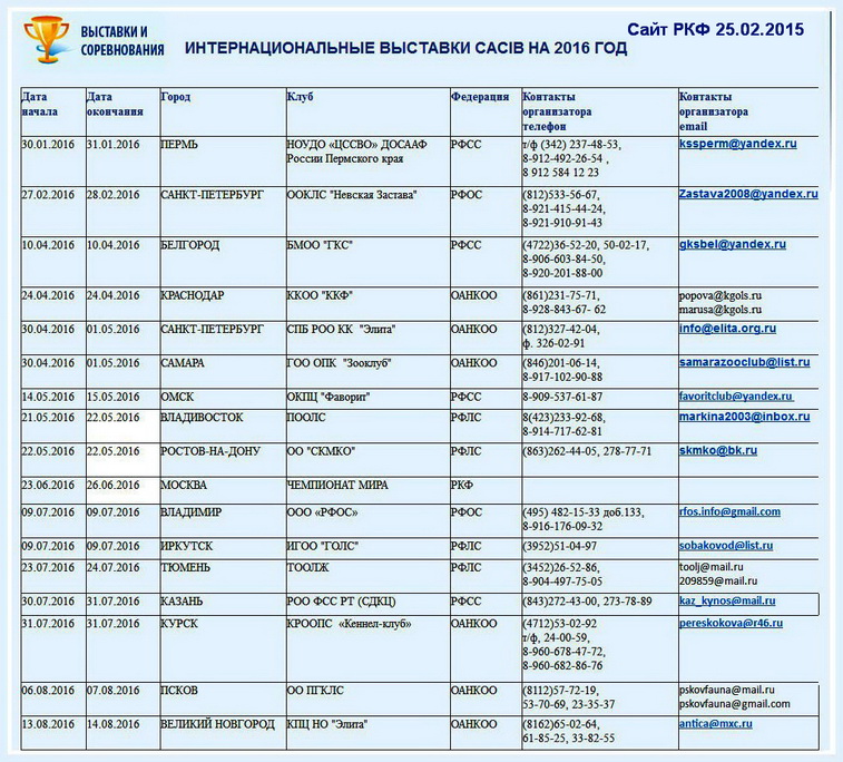 С Сайта РКФ от 25.02.2015 г. - Выставки CACIB на 2016 год